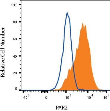 HT-29 human colon adenocarcinoma cell line was stained with Mouse Anti-Human PAR2 Monoclonal Antibody (Catalog # MAB3949, filled histogram) or isotype control antibody (MAB003, open histogram), followed by Phycoerythrin-conjugated Anti-Mouse IgG F(ab')2Secondary Antibody (F0102B).