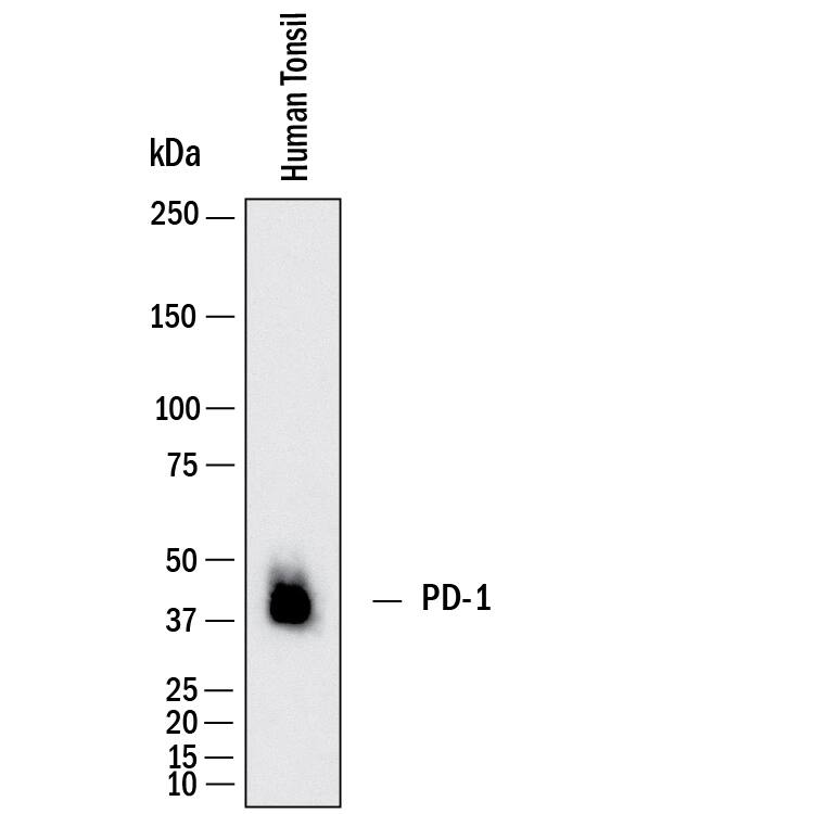 Western Blot shows lysates of human tonsil. PVDF membrane was probed with 2 µg/ml of Mouse Anti-Human PD-1 Monoclonal Antibody (Catalog # MAB11741) followed by HRP-conjugated Anti-Mouse IgG Secondary Antibody (Catalog # HAF018). A specific band was detected for PD-1 at approximately 40 kDa (as indicated). This experiment was conducted under reducing conditions and using Western Blot Buffer Group 1.