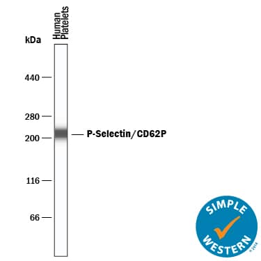 Simple Western lane view shows lysates of human platelets, loaded at 0.2 mg/mL. A specific band was detected for P-Selectin/CD62P at approximately 219 kDa (as indicated) using 50 µg/mL of Sheep Anti-Human/Rat P-Selectin/CD62P Antigen Affinity-purified Polyclonal Antibody (Catalog # AF137) followed by 1:50 dilution of HRP-conjugated Anti-Sheep IgG Secondary Antibody (HAF016). This experiment was conducted under reducing conditions and using the 66-440 kDa separation system.Applications for Human/Rat P-Selectin/CD62P Antibody