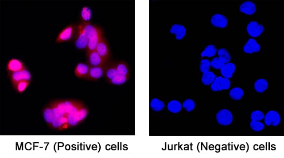 Sample: fixed MCF‑7 human breast cancer cell line (Positive) and absent in Jurkat human acute T cell leukemia cell line (Negative)