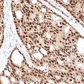 RBX1 was detected in immersion fixed paraffin-embedded sections of prostate tumor using Mouse Anti-Human RBX1 Monoclonal Antibody (Catalog # MAB11499) at 5 µg/ml for 1 hour at room temperature followed by incubation with the HRP-conjugated Anti-Mouse IgG Secondary Antibody (Catalog # HAF007) or the Anti-Mouse IgG VisUCyte™ HRP Polymer Antibody (Catalog # VC001). Before incubation with the primary antibody, tissue was subjected to heat-induced epitope retrieval using VisUCyte Antigen Retrieval Reagent-Basic (Catalog # VCTS021). Tissue was stained using DAB (brown) and counterstained with hematoxylin (blue). Specific staining was localized to the nucleus. View our protocol for Chromogenic IHC Staining of Paraffin-embedded Tissue Sections.