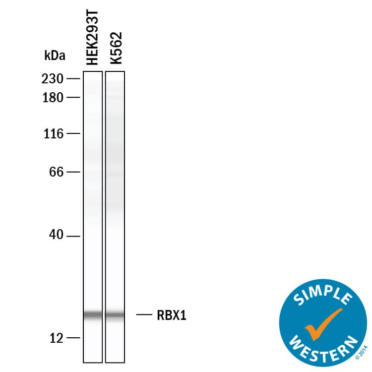 Western Blot shows lysates of K562 human chronic myelogenous leukemia cell line. PVDF membrane was probed with 2 µg/ml of Mouse Anti-Human RBX1 Monoclonal Antibody (Catalog # MAB11499) followed by HRP-conjugated Anti-Mouse IgG Secondary Antibody (Catalog # HAF018). A specific band was detected for RBX1 at approximately 15 kDa (as indicated). This experiment was conducted under reducing conditions and using Western Blot Buffer Group 1.