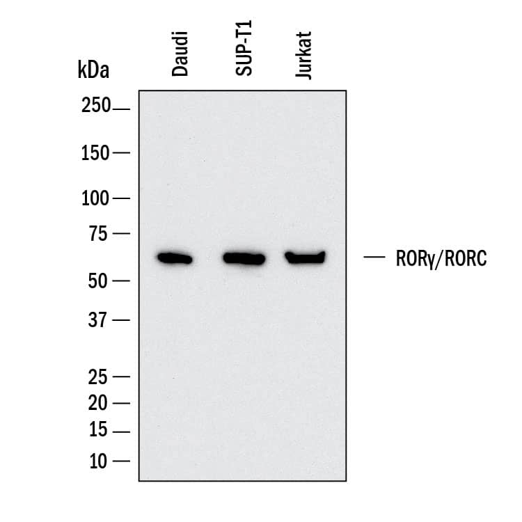 Western Blot shows lysates of Daudi human Burkitt's lymphoma cell line, SUP-T1 human T cell lymphoblastic lymphoma cell line and Jurkat human acute T cell leukemia cell line. PVDF membrane was probed with 2 µg/ml of Mouse Anti-Human ROR gamma/RORC/NR1F3 Monoclonal Antibody (Catalog # MAB11629) followed by HRP-conjugated Anti-Mouse IgG Secondary Antibody (Catalog # HAF018). A specific band was detected for ROR gamma/RORC/NR1F3 at approximately 58 kDa (as indicated). This experiment was conducted under reducing conditions and using Western Blot Buffer Group 1.