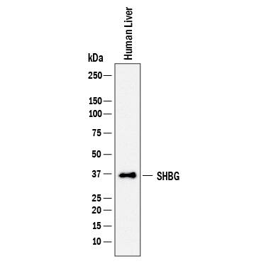 Western blot shows lysates of Human Liver. PVDF membrane was probed with 1 µg/mL of Goat Anti-Human SHBG Antigen Affinity-purified Polyclonal Antibody (Catalog # AF2656) followed by HRP-conjugated Anti-Goat IgG Secondary Antibody (Catalog # HAF017). A specific band was detected for SHBG at approximately ~37 kDa (as indicated). This experiment was conducted under reducing conditions and using Western Blot Buffer Group 1.