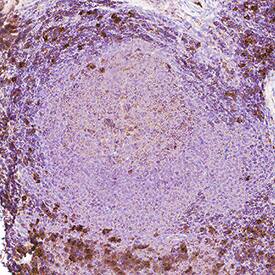 Siglec-2/CD22 was detected in immersion fixed paraffin-embedded sections of Human Tonsil using Llama Anti-Human Siglec-2/CD22 LlaMABodyTM Bivalent VHH HuIgG2 Fusion Monoclonal Antibody (Catalog # LMAB107321) at 15 µg/mL overnight at 4 °C. Tissue was stained using anti-Llama secondaries with HRP and counterstained with hematoxylin (blue). Specific staining was localized to cytoplasm in lymphocytes. View our protocol for IHC Staining with VisUCyte HRP Polymer Detection Reagents.