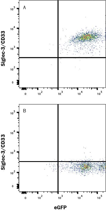 HEK293 human embryonic kidney cell line transfected with either (A) human Siglec-3/CD33 or (B) irrelevant protein and eGFP was stained with Llama Anti-Human Siglec-3/CD33 Llamabody VHH hIgG2 Monoclonal Antibody (Catalog # LMAB10888) followed by Allophycocyanin-conjugated Goat Anti-Human Secondary Antibody (F0135). Staining was performed using our Staining Membrane-associated Proteins protocol.Applications