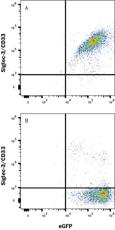 HEK293 human embryonic kidney cell line transfected with either (A) human Siglec-3/CD33 or (B) irrelevant protein and eGFP was stained with Llama Anti-Human Siglec-3/CD33 Llamabody VHH His-tag Monoclonal Antibody (Catalog # LMAB10753) followed by Allophycocyanin-conjugated Anti-His Antibody (IC050A).View our protocol for Staining Membrane-associated Proteins.