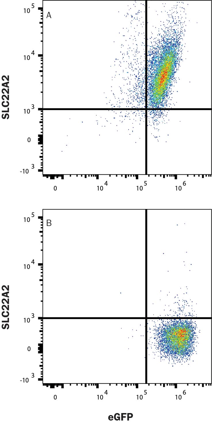 HEK293 human embryonic kidney cell line transfected with EGP and (A) human SLC22A2/OCT2 or (B) irrelevant protein was stained with Mouse Anti-Human SLC22A2/OCT2 Monoclonal Antibody (Catalog # MAB6547) followed by Allophycocyanin-conjugated Anti-Mouse IgG Secondary Antibody (F0101B). Quadrant markers were set based on Mouse IgG2A Isotype Control (MAB003). Staining was performed using our Staining Membrane-associated Proteins protocol.Applications for Human SLC22A2/OCT2 Antibody