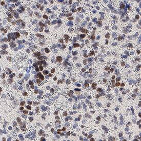 SOX11 was detected in immersion fixed paraffin-embedded sections of human glioblastoma using Mouse Anti-Human SOX11 Monoclonal Antibody (Catalog # MAB11734) at 5 µg/ml for 1 hour at room temperature followed by incubation with the HRP-conjugated Anti-Mouse IgG Secondary Antibody (Catalog # HAF007). Before incubation with the primary antibody, tissue was subjected to heat-induced epitope retrieval using VisUCyte Antigen Retrieval Reagent-Basic (Catalog # VCTS021). Tissue was stained using DAB (brown) and counterstained with hematoxylin (blue). Specific staining was localized to the nucleus. View our protocol for IHC Staining with VisUCyte HRP Polymer Detection Reagents.Detection of SOX11 in human Mantle Cell Lymphoma