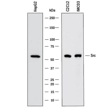 Western blot shows lysates of HepG2 human hepatocellular carcinoma cell line, C2C12 mouse myoblast cell line, and mIMCD-3 mouse epithelial cell line. PVDF membrane was probed with 2 µg/mL of Mouse Anti-Human Src Monoclonal Antibody (Catalog # MAB3807) followed by HRP-conjugated Anti-Mouse IgG Secondary Antibody (HAF018). A specific band was detected for Src at approximately 60 kDa (as indicated). This experiment was conducted under reducing conditions and using Western Blot Buffer Group 1.Src in Human Lung Cancer Tissue.