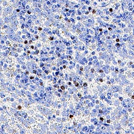 T-bet/TBX21 was detected in immersion fixed paraffin-embedded sections of human lymph node tumor using Rabbit Anti-Human T-bet/TBX21 Monoclonal Antibody (Catalog # MAB11692) at 3 µg/ml for 1 hour at room temperature followed by incubation with the Anti-Rabbit IgG VisUCyte™ HRP Polymer Antibody (Catalog # VC003) or the HRP-conjugated Anti-Rabbit IgG Secondary Antibody (Catalog # HAF008). Before incubation with the primary antibody, tissue was subjected to heat-induced epitope retrieval using VisUCyte Antigen Retrieval Reagent-Basic (Catalog # VCTS021). Tissue was stained using DAB (brown) and counterstained with hematoxylin (blue). Specific staining was localized to the nucleus. View our protocol for IHC Staining with VisUCyte HRP Polymer Detection Reagents.