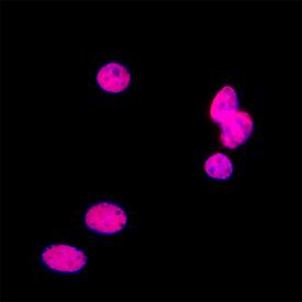 TCEB1 was detected in fixed MCF-7 human breast cancer cell line using Mouse Anti-Human TCEB1 Monoclonal Antibody (Catalog # MAB11569) at 8 µg/ml for 3 hours at room temperature. Cells were stained using the NorthernLights™ 557-conjugated Anti-Mouse IgG Secondary Antibody (red; Catalog # NL007) and counterstained with DAPI (blue). Specific staining was localized to the nucleus. View our protocol for Fluorescent ICC Staining of Cells on Coverslips.