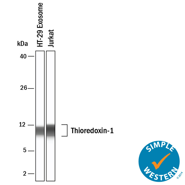 Simple Western shows lysates of Exosome Standards (HT-29) (NBP3-11685) and Jurkat human acute T cell leukemia cell line, loaded at 0.5 mg/ml. A specific band was detected for Thioredoxin-1 at approximately 10 kDa (as indicated) using 10 µg/mL of Goat Anti-Human Thioredoxin-1 Antigen Affinity-purified Polyclonal Antibody (Catalog # AF1970). This experiment was conducted under reducing conditions and using the 2-40kDa separation system.Thioredoxin‑1 in Human Breast Cancer Tissue.