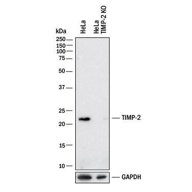 TIMP‑2 is specifically detected in HeLa human cervical epithelial carcinoma parental cell line but is not detectable in TIMP‑2 knockout HeLa human cervical epithelial carcinoma cell line.