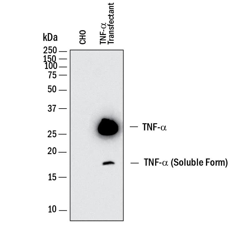 Western Blot shows lysates of CHO Chinese hamster ovary cell line either mock transfected or transfected with human TNF-alpha. PVDF membrane was probed with 2 µg/ml of Rabbit Anti-Human TNF-alpha Monoclonal Antibody (Catalog # MAB2103) followed by HRP-conjugated Anti-Rabbit IgG Secondary Antibody (HAF008). Specific bands were detected for TNF-alpha at approximately 17 and 26 kDa (as indicated). This experiment was conducted under reducing conditions and using Western Blot Buffer Group 1.