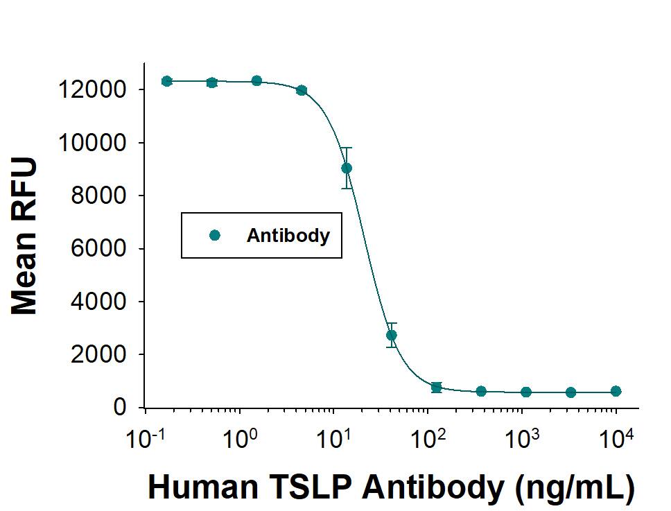 Measured by its ability to neutralize TSLP-induced proliferation in the BaF3 mouse pro‑B cell line transfected with human IL-7 R alpha and human TSLP R. The Neutralization Dose (ND50) is typically 4.00-60.0 ng/mL in the presence of Recombinant Human TSLP (Catalog # 1398-TS).Applications for Human TSLP Antibody