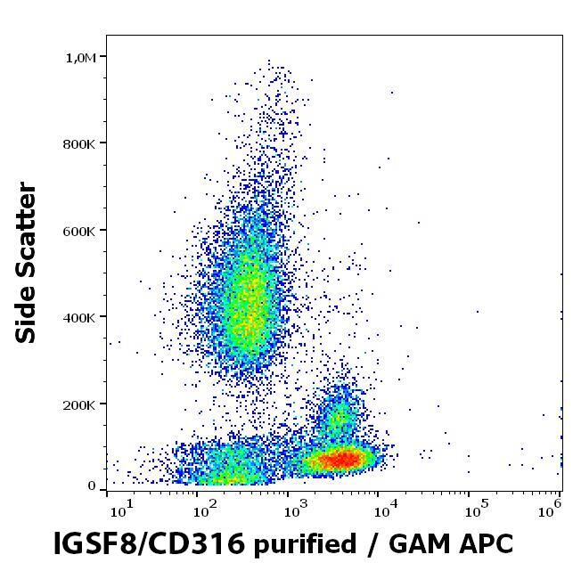 Flow cytometry surface staining pattern of human peripheral whole blood stained using anti-human IGSF8/CD316 (8A12) purified antibody (concentration in sample 5 ug/ml, GAM APC).Applications for IGSF8/CD316 Antibody (8A12) - BSA Free