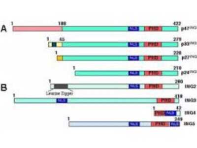 Reactivity occurs against human p47 ING3 protein. This sequence only shows homology to isoform 1 for ING3. The sequence is not present in isoforms 2 and 3. However, 100% homology is on record for this protein from human, dog, rat, chimpanzee and orangutan. Cross reactivity with p47 ING3 protein from mouse and chicken sources is also expected based on high homology (one amino acid change in sequence) by BLAST. Reactivity with p47 ING3 proteins from other sources is not known.