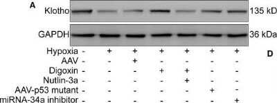 Three isoforms of Klotho are known to exist. Human Klotho has 2 isoforms, including isoform 1 (1012aa, 116kD) and isoform 2 (549aa, 62kD). Mouse Klotho has 2 isoforms, including isoform 1 (1014aa, 116kD) and isoform 2 (550aa, 62kD). Rat Klotho has one isoform (1014aa, 117kD). NBP1-76511 can detect human, mouse and rat.