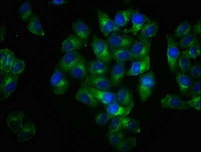 Immunocytochemistry/Immunofluorescence: LAT [p Tyr191] Antibody (2E4) [NBP3-15162] - Immunofluorescence staining of Hela cells with at LAT antibody 1:100, counter-stained with DAPI. The cells were fixed in 4% formaldehyde, permeabilized using 0.2% Triton X-100 and blocked in 10% normal Goat Serum. The cells were then incubated with the antibody overnight at 4°C. The secondary antibody was Alexa Fluor 488-congugated Goat Anti-Rabbit IgG (H+L).