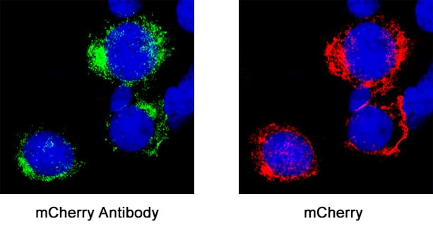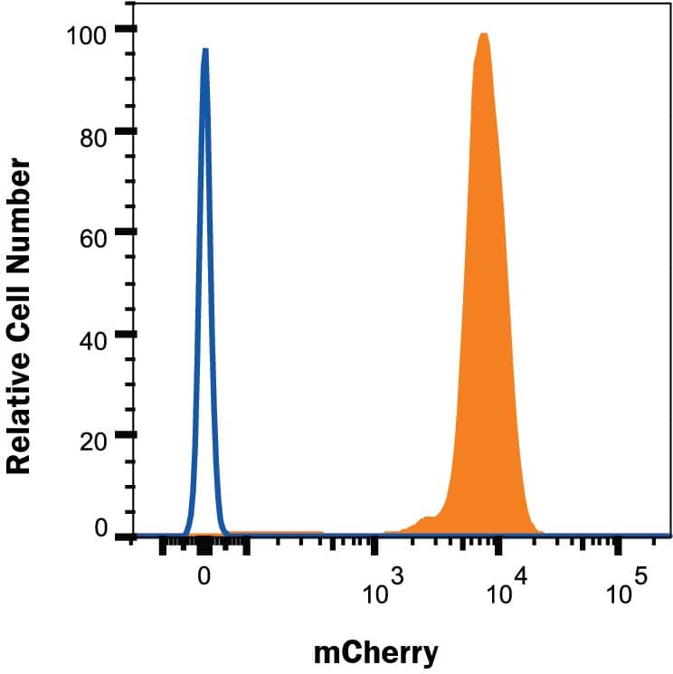 HEK293 human cell line transfected with mCherry (filled histogram) or EGFP (open histogram) was stained with Rabbit Anti-mCherry Monoclonal Antibody (Catalog # MAB11041), followed by Allophycocyanin-conjugated Anti-Rabbit IgG F(ab')2Secondary Antibody (F0111). Gates were set based on isotype control antibody (MAB1050, data not shown). To facilitate intracellular staining, cells were fixed with Flow Cytometry Fixation Buffer (FC004) and permeabilized with Flow Cytometry Permeabilization/Wash Buffer I (FC005). Staining was performed using our Staining Intracellular Molecules protocol.Applications for mCherry Antibody