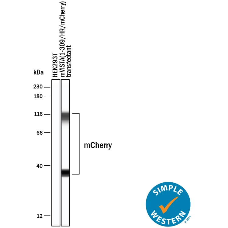 Western blot shows lysates of HEK293 human embryonic kidney cell line either mock transfected or transfected with mVISTA. PVDF membrane was probed with 0.25 µg/mL of Rabbit Anti-mCherry Monoclonal Antibody (Catalog # MAB11041) followed by HRP-conjugated Anti-Rabbit IgG Secondary Antibody (HAF008). A specific band was detected for mCherry at approximately 30-80 kDa (as indicated). This experiment was conducted under reducing conditions and using Western Blot Buffer Group 1.mCherry in HEK293 Human Cell Line Transfected with mCherry.