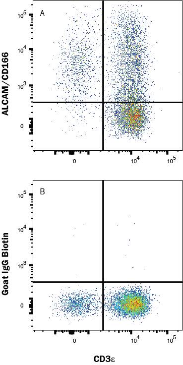 Human PBMC's were stained with Mouse Anti-Human CD3 epsilon PE-conjugated Monoclonal Antibody (Catalog # FAB100P) and either (A) Goat Anti-Mouse ALCAM/CD166 Biotinylated Antigen Affinity-purified Polyclonal Antibody (Catalog # BAF1172) or (B) isotype control antibody (Catalog # BAF108) followed by Streptavidin-Allophycocyanin (Catalog # F0050). View our protocol for Staining Membrane-associated Proteins.Applications for Mouse ALCAM/CD166 Biotinylated Antibody