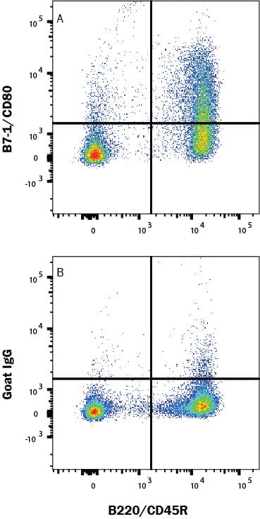 Mouse B6 splenocytes treated with 200 ng/mL LPS for 48 hr were stained with (A) Goat Anti-Mouse B7-1/CD80 Antigen Affinity-purified Polyclonal Antibody (Catalog # AF740) or (B) Goat IgG control antibody (AB-108-C) followed by Phycoerythrin-conjugated Anti-Goat IgG Secondary Antibody (F0107) and Rat Anti-Mouse B220/CD45R Alexa Fluor® 488-conjugated Monoclonal Antibody (FAB1217G). View our protocol for Staining Membrane-associated Proteins.Applications for Mouse B7-1/CD80 Antibody