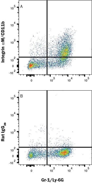 Mouse bone marrow cells were stained with Rat Anti-Mouse Ly-6G/Ly-6C (Gr-1) PE-conjugated Monoclonal Antibody (Catalog # FAB1037P) and either (A) Rat Anti-Mouse CD11b/Integrin alpha M Alexa Fluor® 700-conjugated Monoclonal Antibody (Catalog # FAB1124N) or (B) isotype control antibody (Catalog # IC013N). View our protocol for Staining Membrane-associated Proteins.
