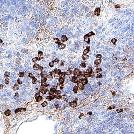CD11c was detected in immersion fixed paraffin-embedded sections of mouse spleen using Hamster Anti-Mouse CD11c Monoclonal Antibody (Catalog # MAB69501) at 25 µg/ml overnight at 4 °C. Before incubation with the primary antibody, tissue was subjected to heat-induced epitope retrieval using VisUCyte Antigen Retrieval Reagent-Basic (Catalog # VCTS021). Tissue was stained using the Mouse Anti-Hamster IgG Antibody (Catalog #MAB011) followed by the HRP-conjugated Anti-Mouse IgG Secondary Antibody (Catalog # HAF007) and counterstained with hematoxylin (blue). Specific staining was localized to the membrane. View our protocol for Chromogenic IHC Staining of Paraffin-embedded Tissue Sections.Applications for Mouse CD11c Antibody
