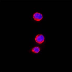 CD163 was detected in fixed Neuro2A cells (Positive) using Rat Anti-Mouse CD163 Monoclonal Antibody (Catalog # MAB7435) at 8 µg/ml for 3 hours at room temperature. Cells were stained using the NorthernLights™ 557-conjugated Anti-Rat IgG Secondary Antibody (red; Catalog # NL013) and counterstained with DAPI (blue). Specific staining was localized to the membrane. View our protocol for Fluorescent ICC Staining of Cells on Coverslips.