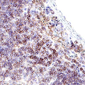 CD45 was detected in immersion fixed paraffin-embedded sections of mouse spleen using Rat Anti-Mouse CD45 Monoclonal Antibody (Catalog # MAB114) at 5 µg/mL for 1 hour at room temperature followed by incubation with the Anti-Rat IgG VisUCyte™ HRP Polymer Antibody (VC005). Before incubation with the primary antibody, tissue was subjected to heat-induced epitope retrieval using Antigen Retrieval Reagent-Basic (CTS013). Tissue was stained using DAB (brown) and counterstained with hematoxylin (blue). Specific staining was localized to cell surface in lymphocytes. Staining was performed using our protocol for IHC Staining with VisUCyte HRP Polymer Detection Reagents.Applications for Mouse CD45 Antibody