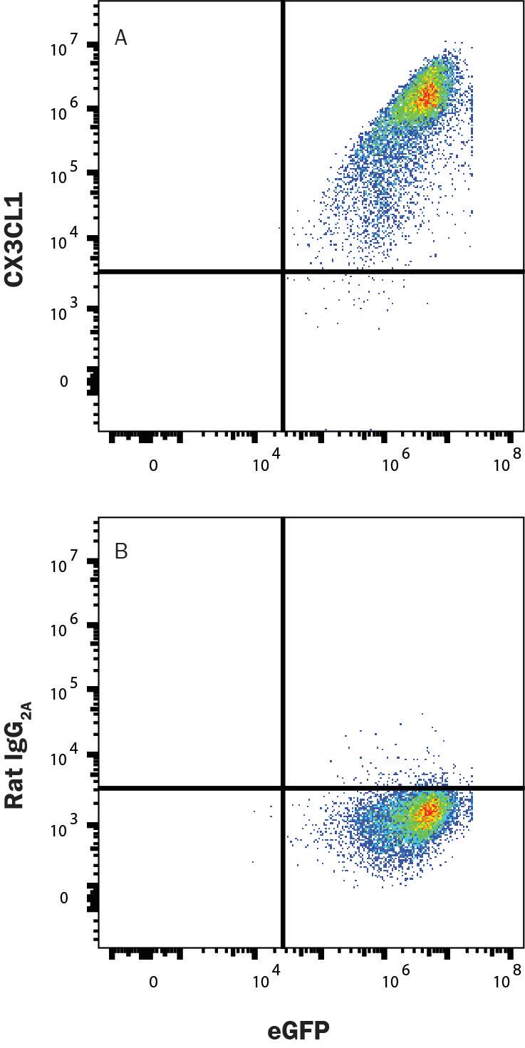 Detection of CX3CL1/Fractalkine in HEK293 cells transfected with mouse CX3CL1 and eGFP cells by Flow Cytometry.