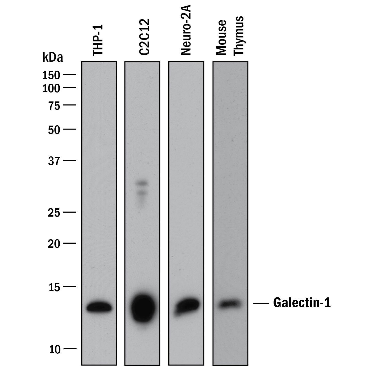 Western blot shows lysates of THP-1 human acute monocytic leukemia cells, C2C12 mouse myoblast cells, Neuro-2A mouse neuroblastoma cells and Mouse Thymus. PVDF membrane was probed with 0.1 µg/mL of Rat Anti-Mouse Galectin-1 Monoclonal Antibody (Catalog # MAB12451) followed by HRP-conjugated Anti-Rat IgG Secondary Antibody (Catalog # HAF005). A specific band was detected for Galectin-1 at approximately 14 kDa (as indicated). This experiment was conducted under reducing conditions and using Western Blot Buffer Group 1.