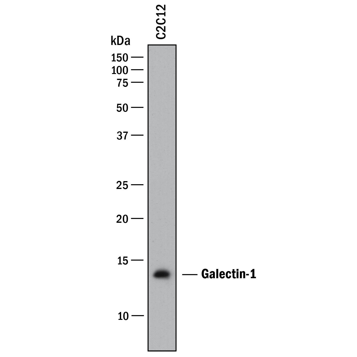 Western blot shows lysates of C2C12 mouse myoblast cell line. PVDF membrane was probed with 2 µg/mL of Rat Anti-Mouse Galectin-1 Monoclonal Antibody (Catalog # MAB1245) followed by HRP-conjugated Anti-Rat IgG Secondary Antibody (Catalog # HAF005). A specific band was detected for Galectin-1 at approximately 14 kDa (as indicated). This experiment was conducted under reducing conditions and using Western Blot Buffer Group 1.