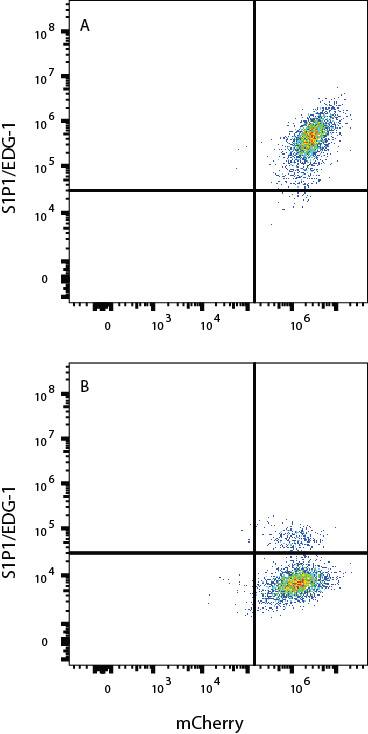 Rat Anti-Mouse S1P1/EDG-1 Alexa Fluor® 488-conjugated Monoclonal Antibody (Catalog # FAB7089G) detection in mEDG-1 HEK/mCherry transfectants (A) or irrelevant mCherry transfectants (B). View our protocol for Staining Membrane-associated Proteins.