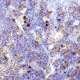 TIGIT was detected in immersion fixed paraffin-embedded sections of mouse spleen using Sheep Anti-Mouse TIGIT Antigen Affinity-purified Polyclonal Antibody (Catalog # AF7267) at 3 µg/mL for 1 hour at room temperature followed by incubation with the Anti-Sheep IgG VisUCyte™ HRP Polymer Antibody (VC006). Before incubation with the primary antibody, tissue was subjected to heat-induced epitope retrieval using Antigen Retrieval Reagent-Basic (CTS013). Tissue was stained using DAB (brown) and counterstained with hematoxylin (blue). Specific staining was localized to lymphocytes. Staining was performed using our protocol for IHC Staining with VisUCyte HRP Polymer Detection Reagents.