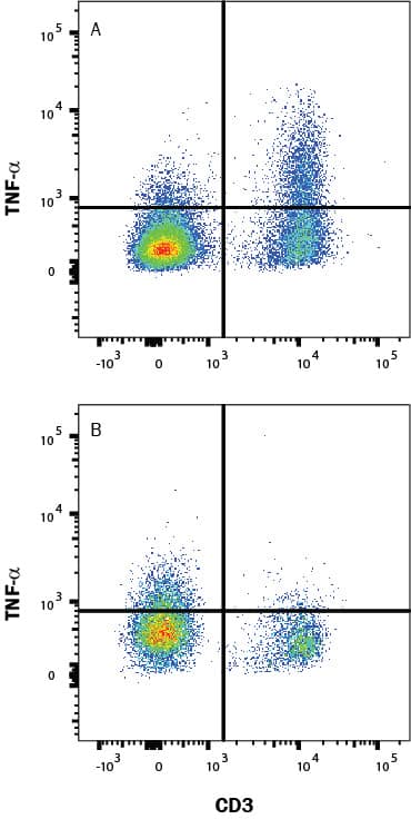 Mouse splenocytes (A) treated with PMA (50 ng/mL), Ca2+ Ionomycin (200 ng/mL) and Brefeldin A (5 μg/mL) for 4 hours or (B) untreated, were stained with Rat Anti-Mouse TNF-alpha Monoclonal Antibody (Catalog # MAB4101) followed by Anti-Rat IgG PE-conjugated Secondary Antibody (F0105B) and Rat anti-Mouse CD3 APC-conjugated Monoclonal Antibody (FAB4841A). Quadrant markers were set based on isotype control antibody (MAB005). To facilitate intracellular staining, cells were fixed with Flow Cytometry Fixation Buffer (FC004) and permeabilized with Flow Cytometry Permeabilization/Wash Buffer I (FC005). Staining was performed using our protocol for Staining Intracellular Molecules.Cytotoxicity Induced by TNF-alpha and Neutralization by Mouse TNF-alpha Antibody.