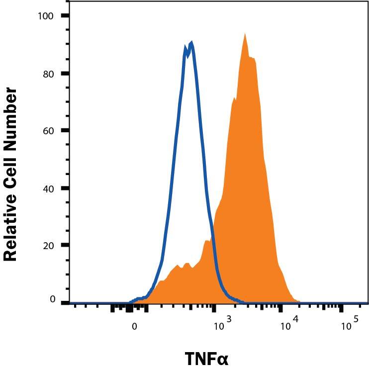 EL-4 mouse lymphoblast cell line treated with anti-CD3/anti-CD28, PMA, and Calcium Ionomycin was stained with Rat Anti-Mouse TNF-a PE-conjugated Monoclonal Antibody (Catalog # IC410P, filled histogram) or isotype control antibody (IC005P, open histogram). To facilitate intracellular staining, cells were fixed with Flow Cytometry Fixation Buffer (FC004) and permeabilized with Flow Cytometry Permeabilization/Wash Buffer I (FC005). View our protocol for Staining Intracellular Molecules.Detection of TNF-alpha in Raw264.7 cells by Flow Cytometry.