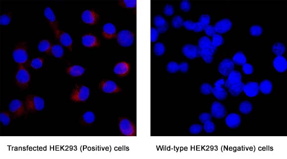 Sample: Immersion fixed Transfected HEK293 human embryonic kidney cells (positive), mIMCD-3 mouse epithelial cells (positive), and wild-type HEK293 human embryonic kidney cells (negative)