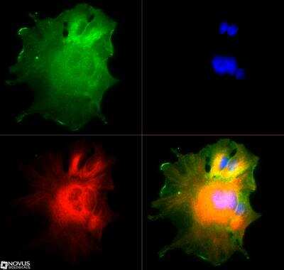 Immunocytochemistry/Immunofluorescence: NUMB Antibody [NB500-178] - The NUMB antibody was tested in HepG2 cells at a 1:500 dilution against Dylight 488 (Green). Alpha-tubulin and nuclei were counterstained against Dylight 550 (Red) and DAPI (Blue), respectively.