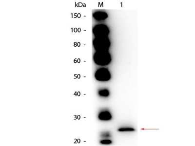 Western Blot: Papain Antibody [Biotin] [NB120-20595] - Lane 1: Papain. Load: 50 ng per lane. Primary antibody: Goat anti-Papain Antibody Biotin Conjugated at 1:1,000 overnight at 4C. Secondary antibody: HRP Streptavidin secondary antibody at 1:40,000 for 30 minutes at RT. Block: incubated with blocking buffer for 30 minutes at RT. Predicted/Observed size: 23 kDa, 23 kDa for Papain.