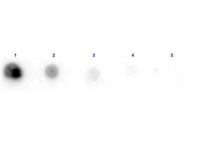 Dot Blot: Penicillinase Antibody [Biotin] [NB100-2006] - Dot Blot results of Rabbit Penicillinase antibody [Biotin].Dots are Penicillinase at (1) 100ng, (2) 33.3ng, (3) 11.1ng, (4) 3.70ng, (5) 1.23ng. Blocking: 30 min at RT.Primary Antibody: Rabbit Anti-Penicillinase Biotin at 1ug/mL for 1hr at RT.Secondary Antibody: Streptavidin-HRP at 1:40,000 for 30min at RT.