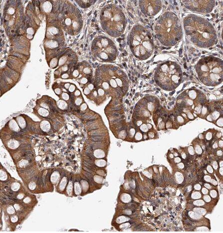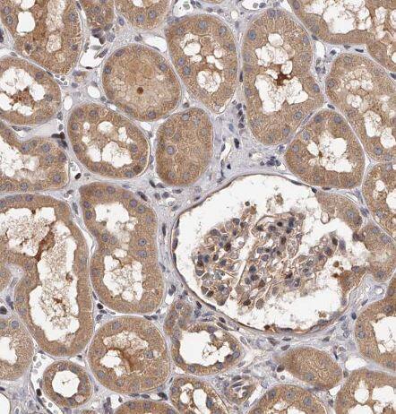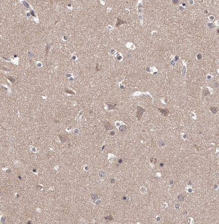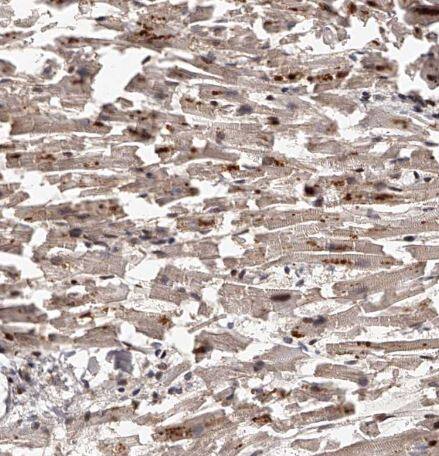 Staining of human cerebral cortex shows moderate cytoplasmic positivity in neuropil.Staining of human heart muscle shows moderate cytoplasmic positivity in cardiomyocytes.