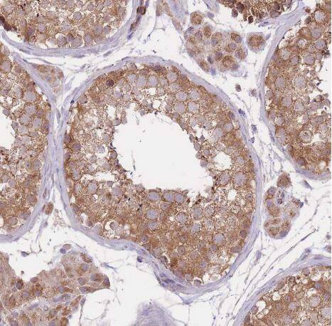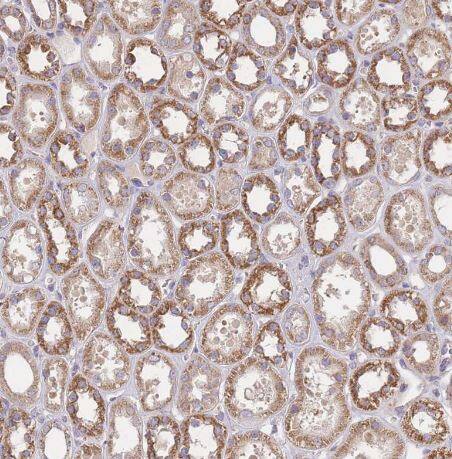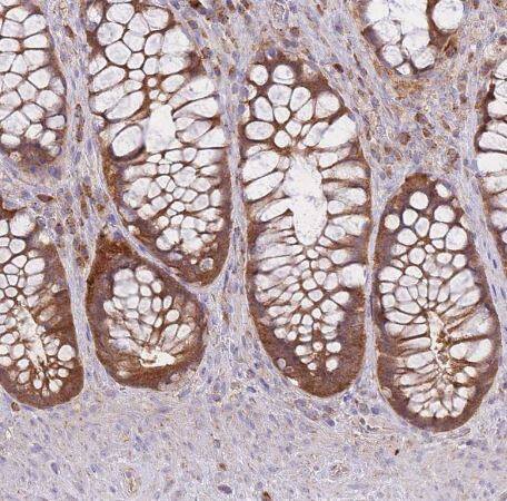 Staining of human Rectum shows moderate cytoplasmic positivity in glandular cells.Applications for Prolyl Oligopeptidase/PREP Antibody - BSA Free