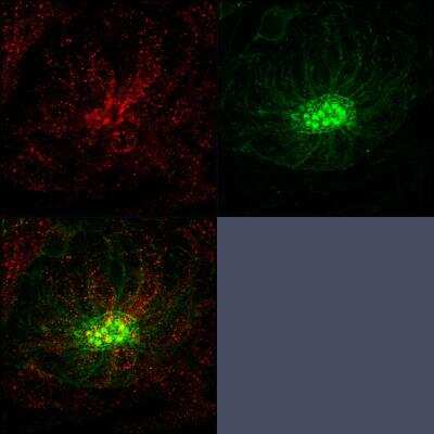 Chromatin Immunoprecipitation: RAB3IP Antibody [H00117177-B01P] - 5dpf neuromast immunostained for Rab3IP (red) and counterstained with phalloidin (green). Image courtesy of customer.