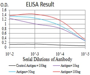 ELISA: RNA polymerase I termination factor Antibody (2F4B12) [NBP3-27123] - Black line: Control Antigen (100 ng); Purple line: Antigen (10 ng); Blue line: Antigen (50 ng); Red line: Antigen (100 ng)
