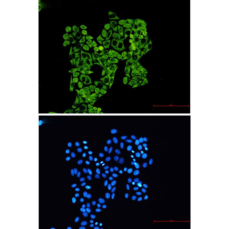 Immunocytochemistry/ Immunofluorescence: RPS8 Antibody (SR2540) [NBP3-27806] - Immunocytochemistry analysis of RPS8 (green) in Hela using NBP3-27806, and DAPI (blue)Western Blot: RPS8 Antibody (SR2540) [NBP3-27806] -
