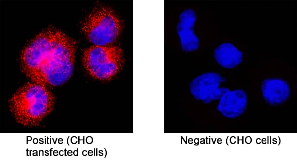 Spike RBD was detected in immersion fixed CHO Chinese hamster ovary cell line transfected with SARS-CoV-2 (positive staining) and CHO Chinese hamster ovary cell line (non-transfected, negative staining) using Mouse Anti-SARS-CoV-2 Spike RBD Monoclonal Antibody (Catalog # MAB108271) at 8 µg/mL for 3 hours at room temperature. Cells were stained using the NorthernLights™ 557-conjugated Anti-Mouse IgG Secondary Antibody (red; Catalog # NL007) and counterstained with DAPI (blue). Specific staining was localized to cytoplasm. View our protocol for Fluorescent ICC Staining of Cells on Coverslips.Applications for SARS-CoV-2 Spike RBD Antibody