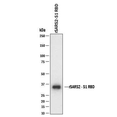 Western blot shows lysates of rSARS2-S1 RBD (DNVY28). PVDF membrane was probed with 2 µg/mL of Rabbit Anti-SARS-CoV-2 Spike RBD Monoclonal Antibody (Catalog # MAB11198) followed by HRP-conjugated Anti-Rabbit IgG Secondary Antibody (Catalog # HAF008). A specific band was detected for Spike RBD at approximately 35 kDa (as indicated). This experiment was conducted under reducing conditions and using Western Blot Buffer Group 1.Applications for SARS-CoV-2 Spike RBD Antibody